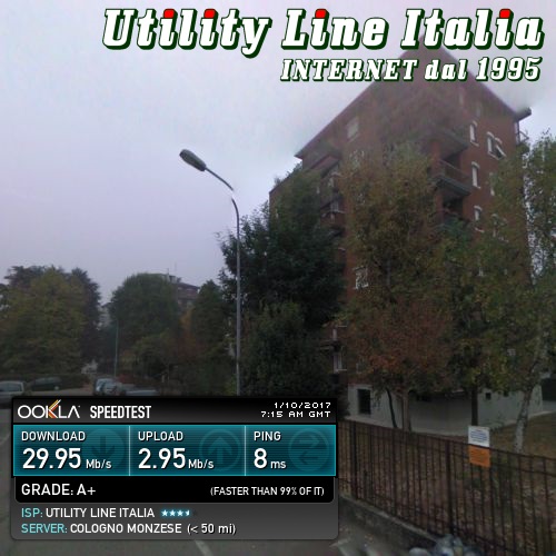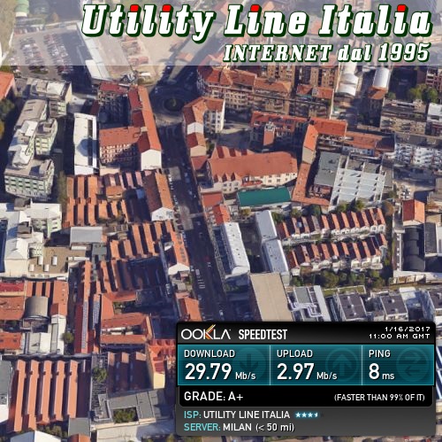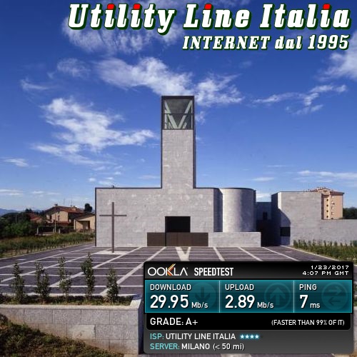Valori riscontrati: Download=29.95 Mbps - Upload=2.95 Mbps