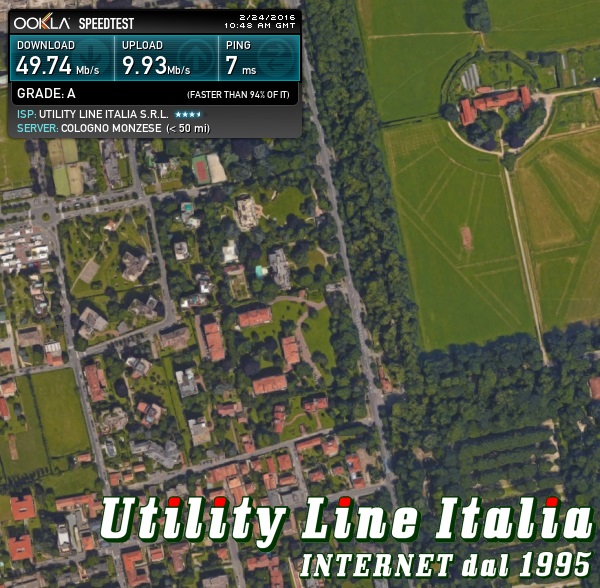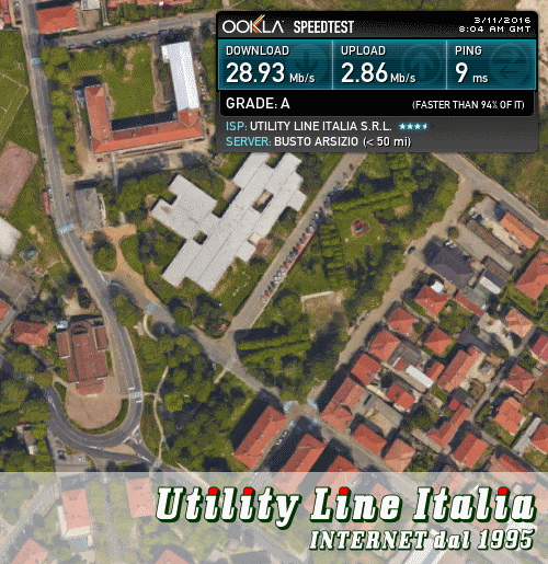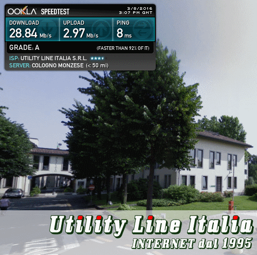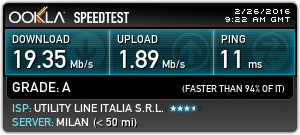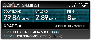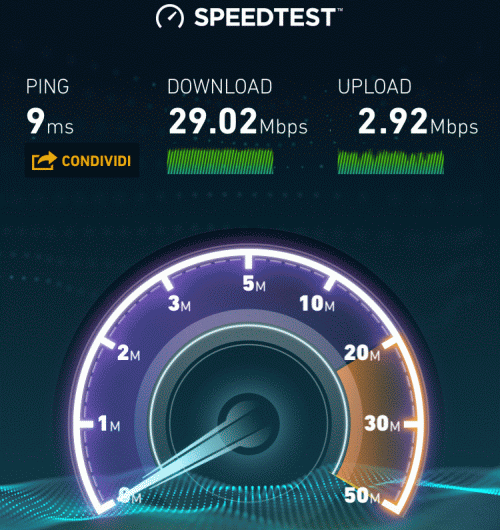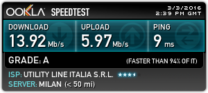 Valori riscontrati: Download=14.30 Mbps - Upload=13.72 Mbps