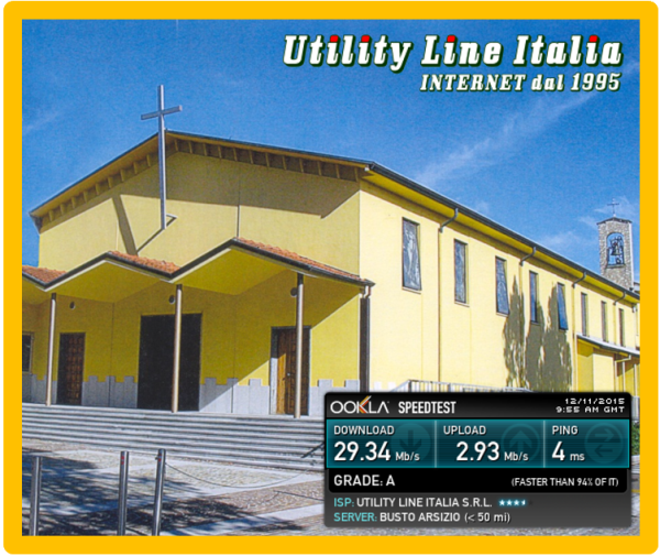 Consegnato collegamento in Fibra Ottica FTTC 30 Mega (UV30330M/3M) a SEVESO (MB) presso la Parrocchia S.Carlo di Altopiano. Valori riscontrati:Download=29.34 Mbps - Upload=2.93 Mbps