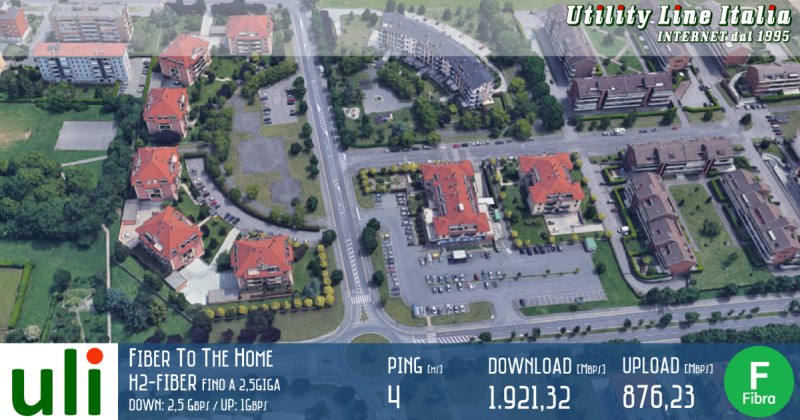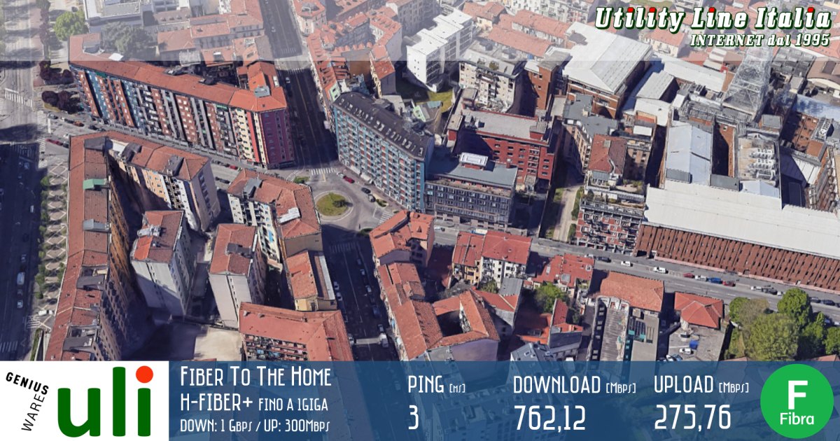 Continua il percorso di upgrade da FTTC a FTTH grazie alla Fibra Ottica di Uility Line Italia con profilo H-FIBER PLUS fino a 1 Giga. Nell'ultima installazione a Milano in Via Giacosa in collaborazione con il Partner commerciale GeniusWare i valori riscontrati sono: Download=762,12 Mbps - Upload=275,76Mbps.