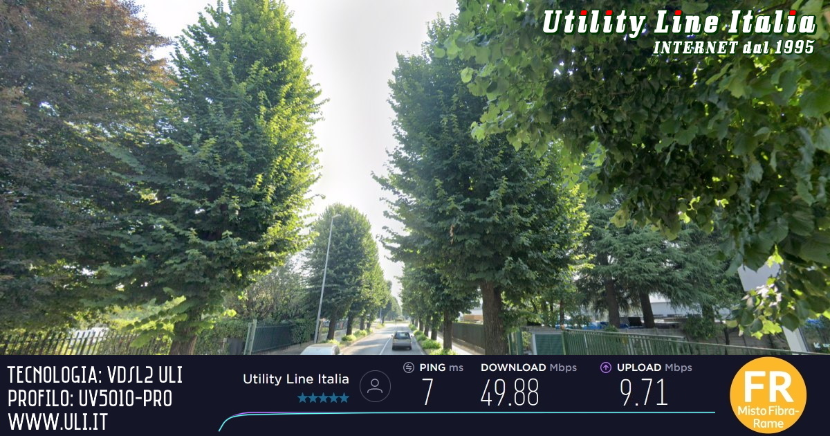 Valori riscontrati: Download=49.88 Mbps - Upload=9.71Mbps