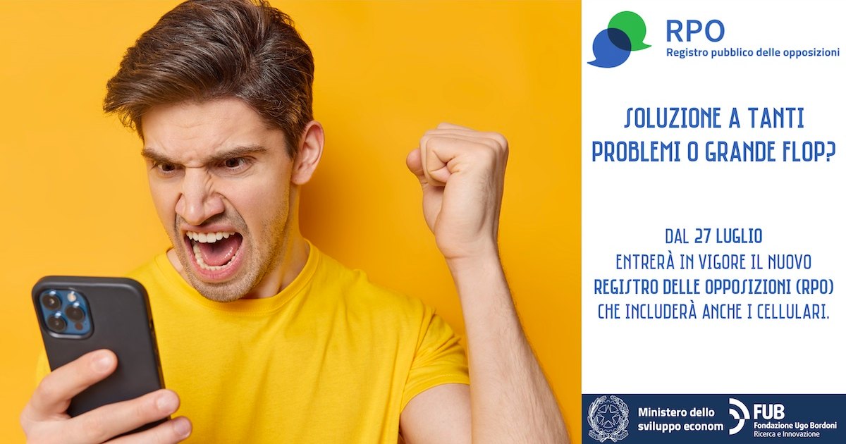 Da domani 27 luglio 2022 sarà in funzione la nuova versione del Registro delle Opposizioni (Rpo), lo strumento consentirà di non ricevere chiamate indesiderate anche su numeri cellulari oltre che ai fissi. Sarà gestito dalla Fondazione Ugo Bordoni (FUB) per conto del Ministero dello Sviluppo Economico (MISE).