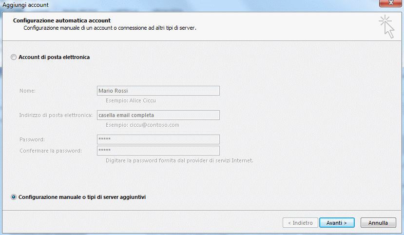 2. Inserire il nome dell'Account, l'indirizzo della casella email e la relativa password. Scegliere poi la configurazione manuale