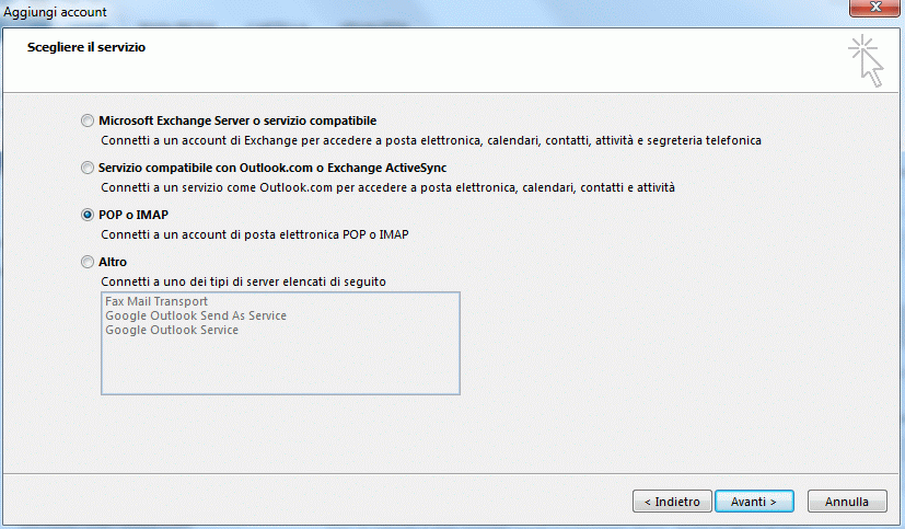 3. Selezionare il tipo di servizio "POP o IMAP"