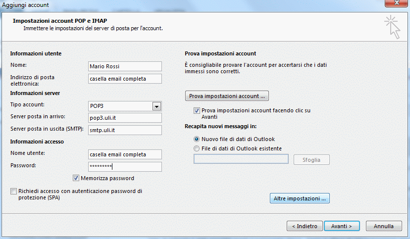 4. Inserire il server di posta in arrivo (pop3.uli.it), il server di posta in uscita (smtp.uli.it), il nome utente (la casella email completa), la relativa password ed infine cliccare su Altre impostazioni.