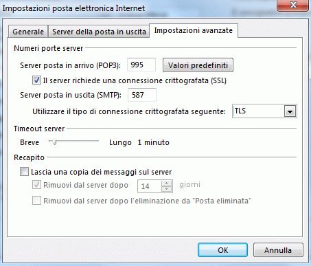 6. Inserire la spunta su "Il server richiede una connessione crittografata (SSL)" verificando che la porta sia la 995 e selezionare tra le crittografie del server in uscita TLS andando a modificare il numero della porta in 587.