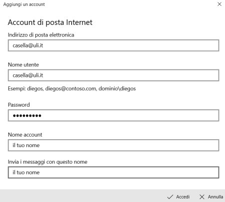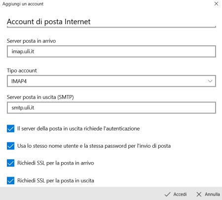 - Scegliere IMAP o POP secondo la propria esigenza e inserire tutte le informazioni della posta in arrivo (per POP3: pop3.uli.it) e del server di posta in uscita e proseguire