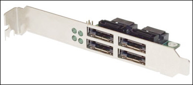 Il connettore eSATA consente di avere dischi esterni ad alte prestazioni (anche 2.4 Gbit/s di velocità di canale contro i 480Mbps di USB 2.0 e i 400/800Mbps di FireWire) con hot plugging come con USB e Firewire. Il cavo può arrivare a 2 metri di lunghezza grazie ad apposite revisioni dei parametri elettrici di funzionamento dello standard SATA. I connettori eSATA possono essere direttamente supportati dalla motherboard, oppure essere installati con un apposito adattatore. Esistono anche adattatori SATA-eSATA, più semplici e non in grado di adeguare i livelli elettrici; con essi la lunghezza massima del cavo non può superare un metro, come nel caso SATA interno.